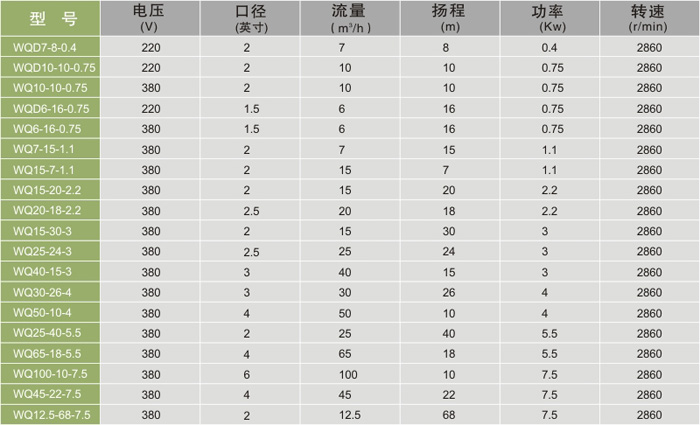 产品概述WQD、WQ系列污水物潜水泵(以下简称电泵)。主要用于排送生活废水、污水、人粪尿及含有短纤维纸屑、木屑、淀粉、泥沙、碎石粒等固体悬浮物和非腐蚀性介质。被抽送液体温度不超过40℃,密度不大于200kg/m3,PH值5~9。该电泵采用双端面机械密封和旋流式叶轮(叶轮采用不锈钢、铸钢两种)具有耐磨损、不堵塞、不缠绕。体积小、结构紧凑、携带方便等特点。