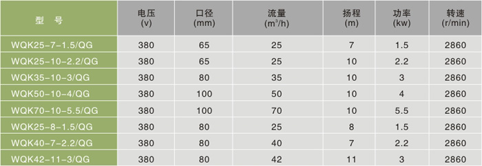 产品概述WQK/QG系列带切割装置潜水泵,具有排污通过能力特别强,带切割性能好,能将污水中的长纤维、塑料、纸带、布条、稻草、绳子等杂质切碎后排出,采用最先进的方法,设计成最合理的水力特性,使电泵可以全扬程运行,优良的干式电机和水泵的最佳组合,使电泵的总效率达到西德ABS公司的AS带切割装置系列产品相同。电泵采用高质量的硬质合金,双端面机械密封和骨架油封组合的动密结构。为了电泵的正常运行及工作人员的安全,用户应配备电动机的漏电保护器。在长时间内工作,本泵电机不允许露出液面部位,抽送污物温度不超过40℃。